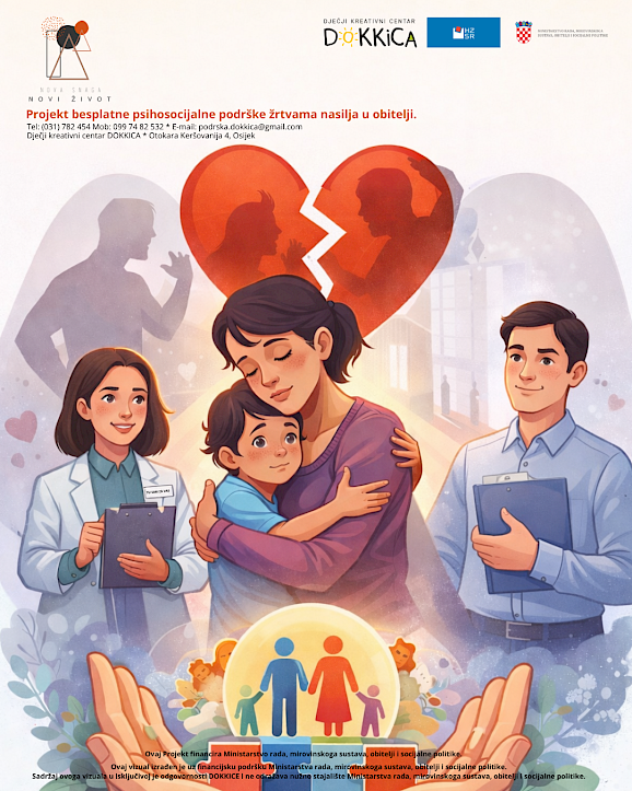 Hrvatski zavod za socijalni rad – Područni ured Osijek partner je u provedbi projekta „Nova snaga – novi život“, koji provodi Dječji kreativni centar DOKKICA uz financijsku potporu Ministarstva rada, mirovinskoga sustava, obitelji i socijalne politike u okviru Poziva za prijavu projekata udruga koje pružaju usluge savjetovališta za žrtve nasilja u obitelji i žrtve seksualnog nasilja u Republici Hrvatskoj za 2025. godinu.